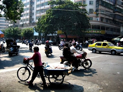 by using some kind of trishaw..